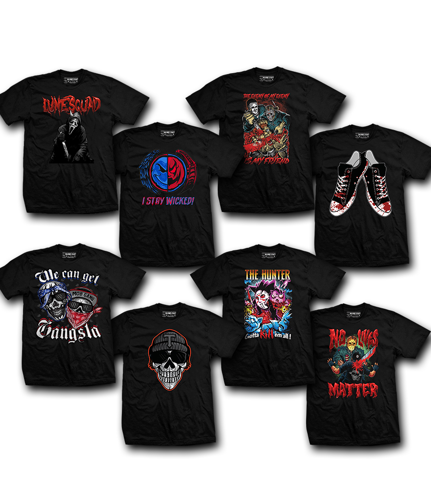 Everyone keeps asking us about the shirts we took in the Freek Show Tour, so here you are – you’re welcome! Not only did we include the infamous 4 shirts from the tour, but we also brought you 2 brand new shirts drops with the “We Can Get Gangsta” and Mobstyle’s newest artist “Timbo’s very first shirt, as well as the Lune Squad “Scream” shirt that was only offered at Hallowbleed until now, AND we brought the “Bloody Chucks” tee back from the dead! You do get a 10% discount when you purchase 2 or more shirts!